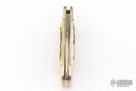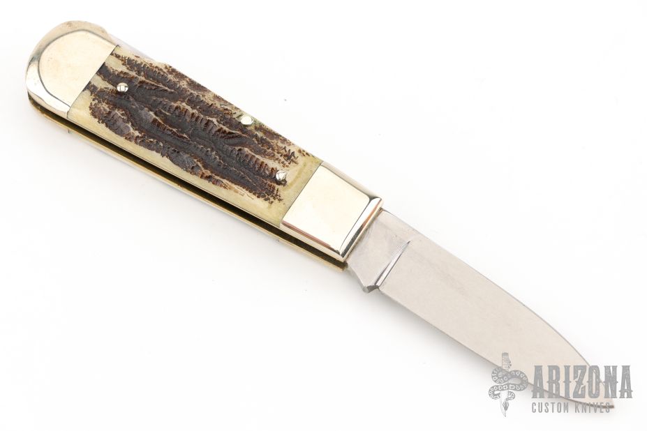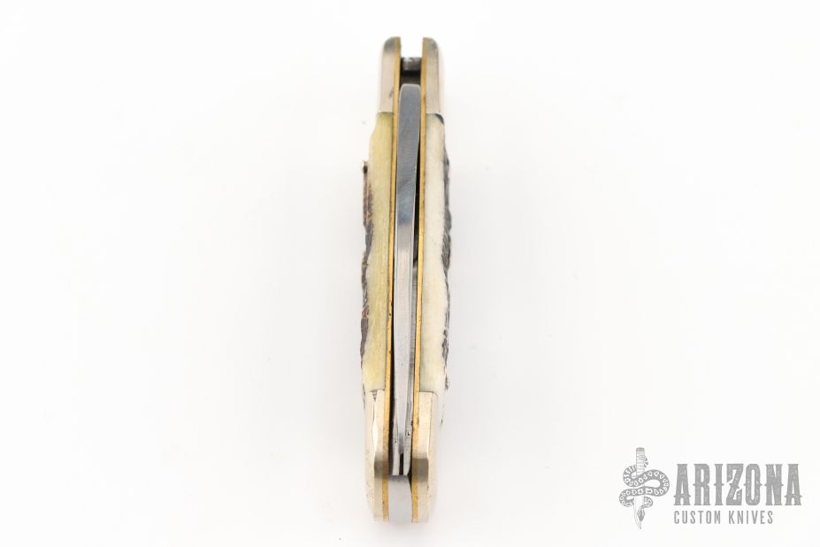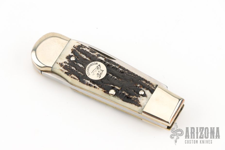This knife by Weidmannsheil features a tumble polished blade with nail nick. The handle has nickel silver bolsters, jigged bone covers, brass liners and steel spring. Has a few light scratches, otherwise excellent condition.