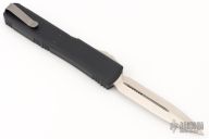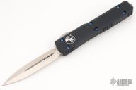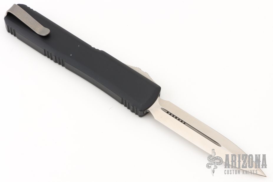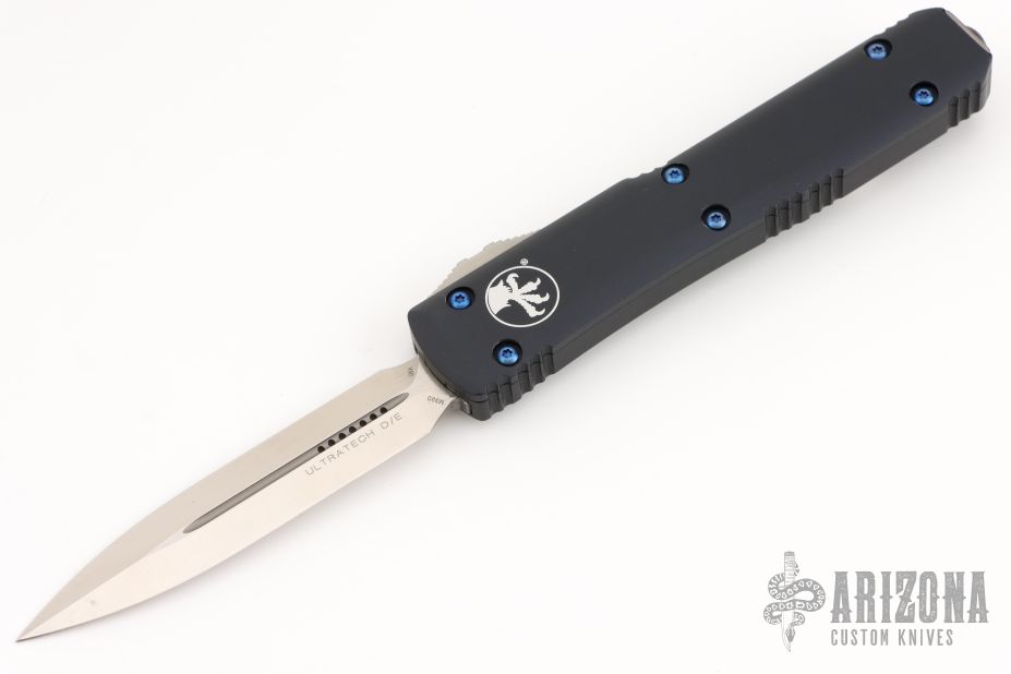 This Ultratech OTF automatic by Microtech knives features a D/E satin finished double-edged blade with a standard edge, and a black aluminum handle with blue aftermarket hardware, and aftermarket tip down carry with tail fastener. Comes with original box and papers. Does not come with original hardware or clip. Has some scuffs and scratches, and some marring on the hardware. Great condition otherwise.