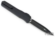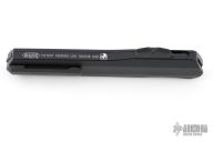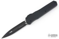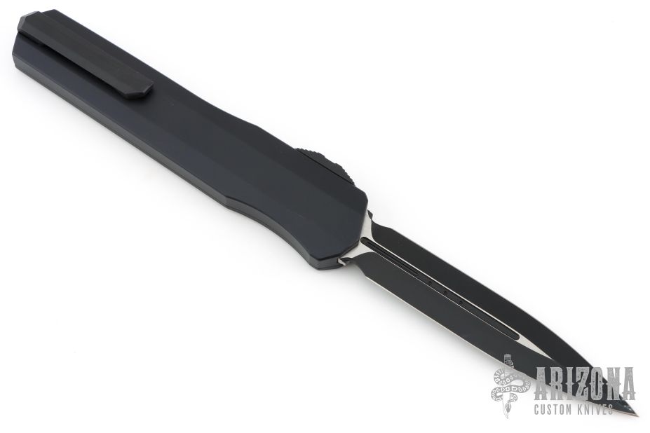 This Cypher OTF is a collaboration between Anthony Marfione and DC Monroe. It features a black double edged blade with satin flats and standard edges. The handle has a black anodized aluminum handle with silver hardware, and a titanium tip down clip and a titanium insert at the butt. 03/2018 and #1248. Comes with original box and papers. Has some scuffs and scratches, excellent condition otherwise.