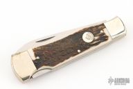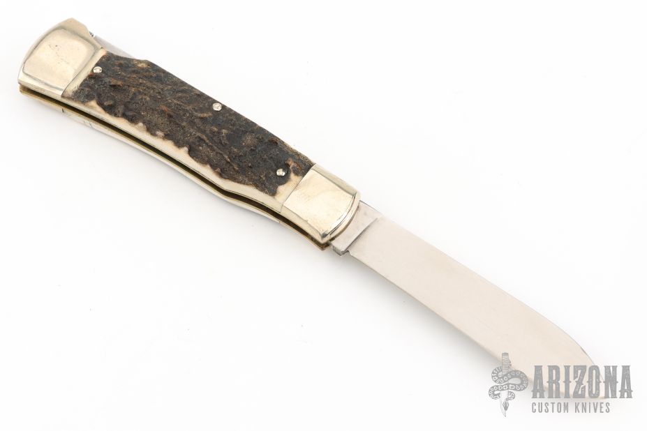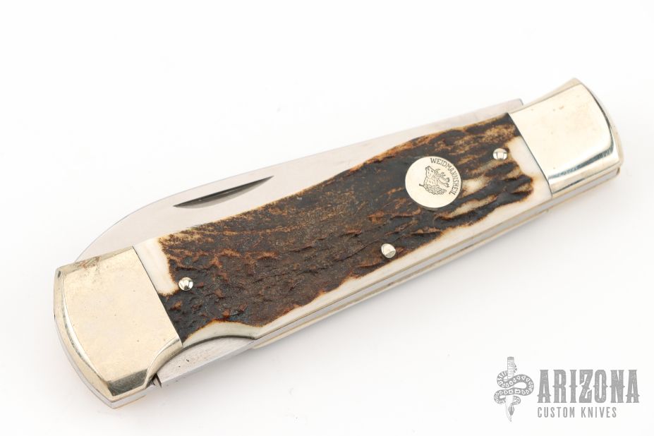This knife by Weidmannsheil features a tumble polished blade with nail nick. The handle has nickel silver bolsters, stag covers, brass liners and steel spring. Has a few light scratches, otherwise excellent condition.