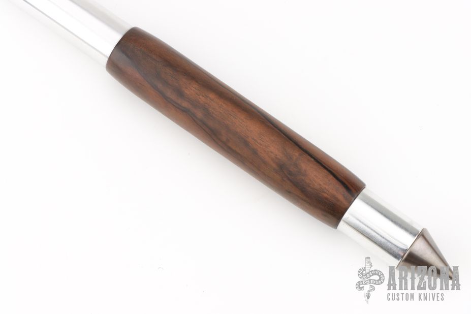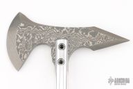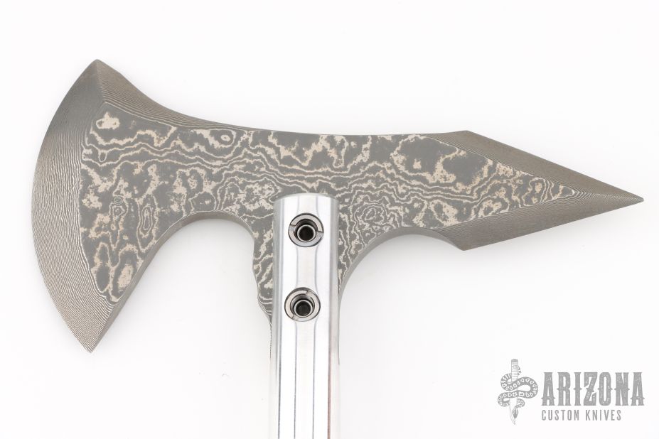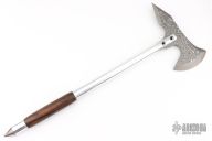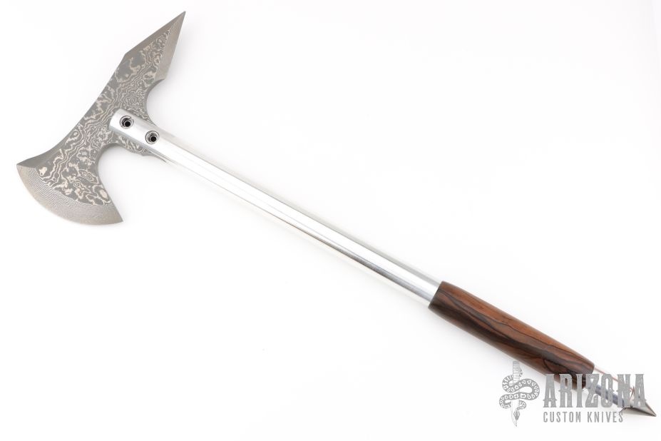 This Tomahawk from Juergen Schanz features a Damascus blade. The handle is comprised of aircraft aluminum with a wooden grip and stainless steel spike on pommel. 22" overall length. Has a few light scuffs, otherwise excellent condition.