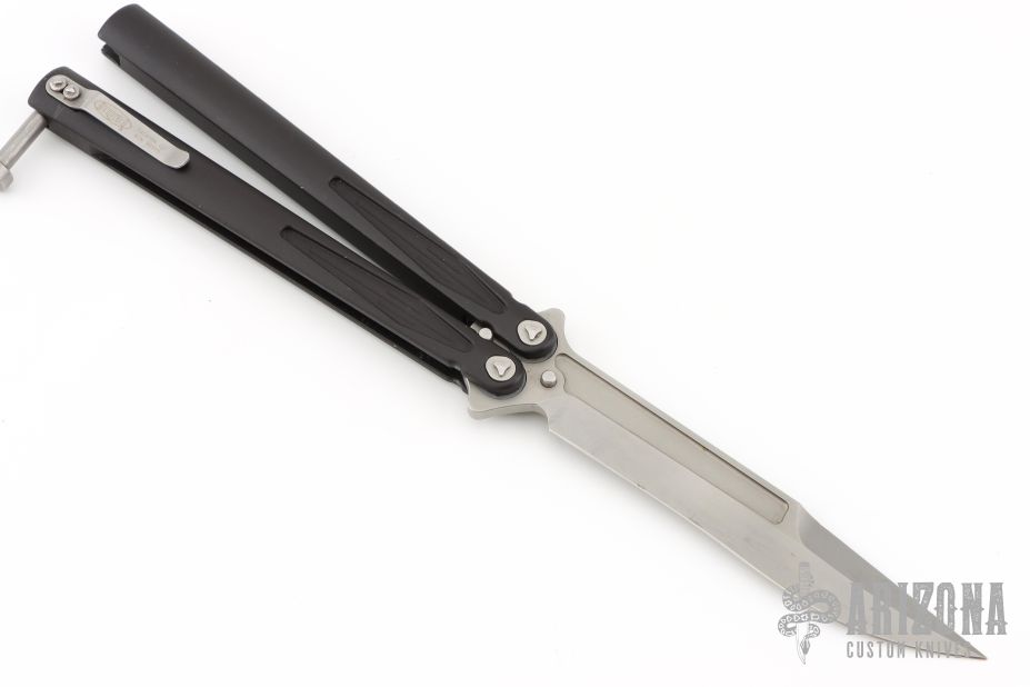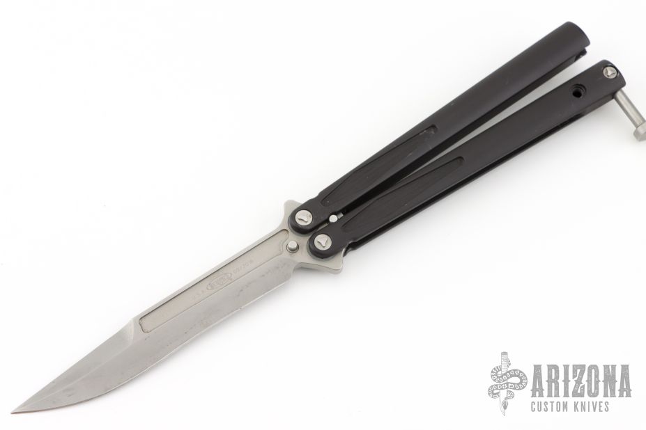 This Tachyon III balisong by Microtech Knives has a bead blast finished blade with false top edge. The handles are integral black aluminum with spring latch and tip up stainless steel clip, all blasted hardware. Dated 09/2016 and s/n 00395. Includes the original box and papers. Has scuffs, scratches, patina, and some marring on the hardware. Good condition otherwise.