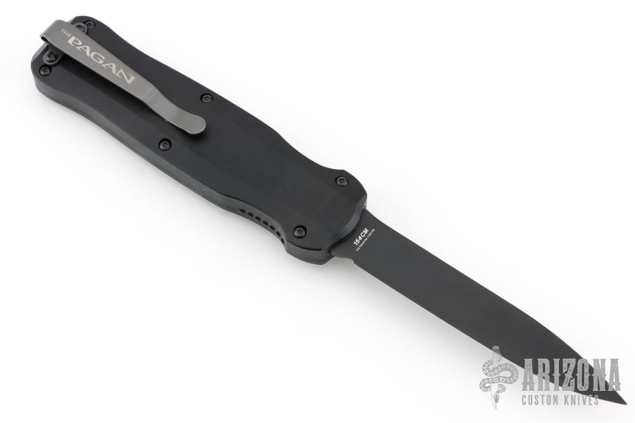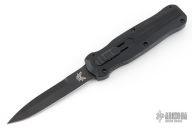 This 3321BK Pagan from Benchmade features a black coated, chisel ground spear point blade with false top edge. The handle is comprised of milled and black coated aluminum. Has some light scuffs, otherwise Excellent condition. Comes with original box and papers.