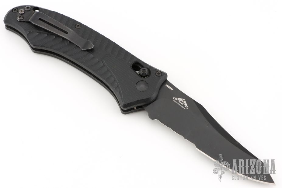This Osborne designed Rift from Benchmade features a black coated clip point blade and sculpted black G-10 scales, black stainless steel liners and tip up reversible clip. Includes original box and papers. Excellent condition.