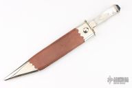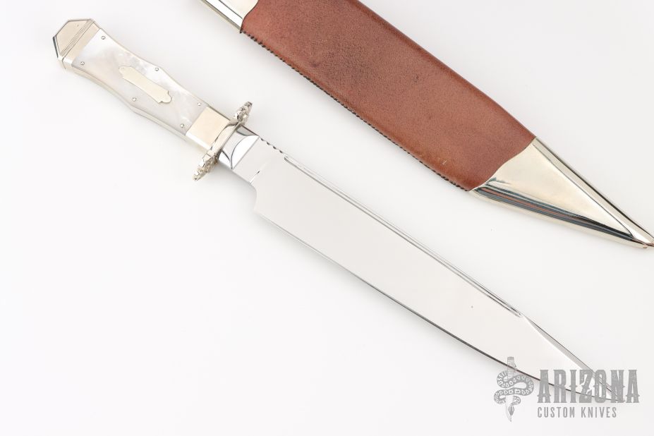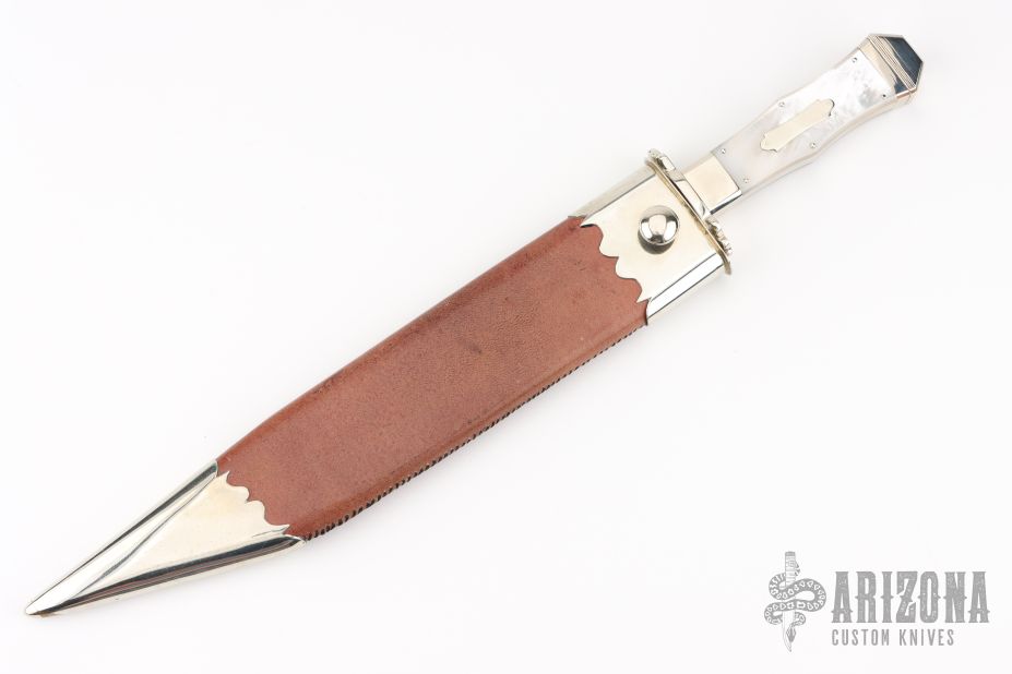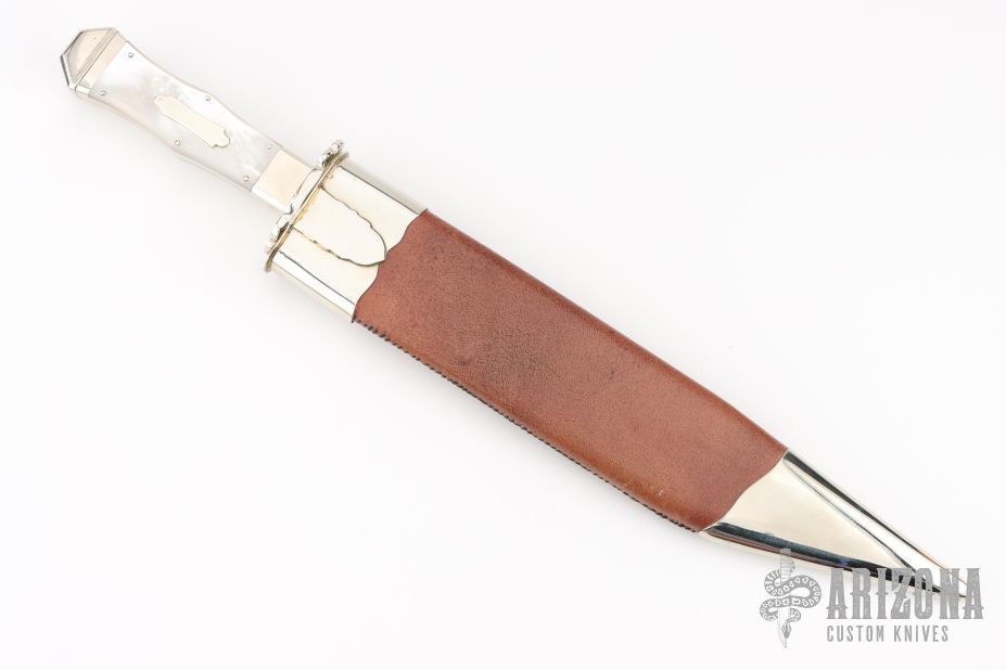 This Bowie by Jim Lofgreen features a mirror polished blade with fullers and fileworked thumbrest, .227" blade stock and 1.718" blade depth, hidden/frame tang construction. The handle has a polished and fileworked nickel silver guard, bolsters, butt and frame, mother of pearl scales with nickel silver escutcheon. Comes with a brown leather and nickel silver sheath. Comes with a zippered case. Has a few light scratches, otherwise excellent condition.