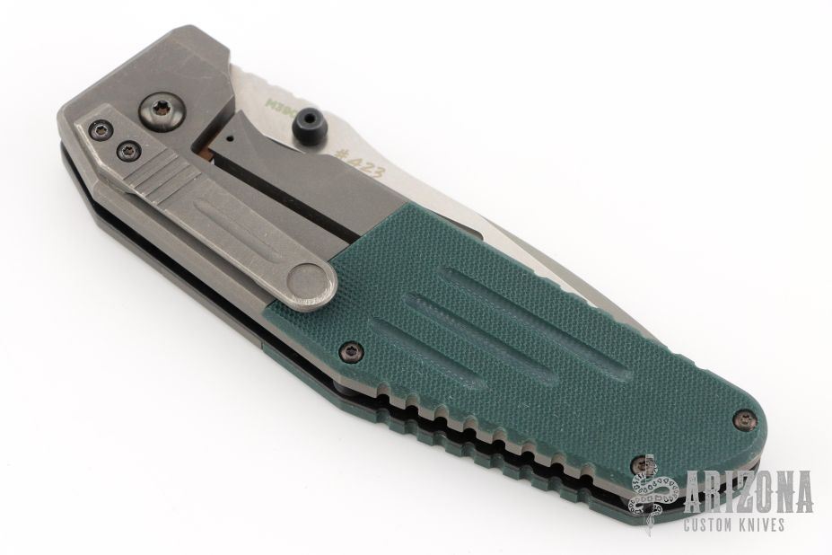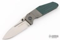 This MLK D/A by Benchmade is a Shane Sibert design, it features a tumble finished blade with dual thumbstuds, and a notched thumbrest. The handle has a bead blasted titanium frame with green G-10 scales, a black stainless steel liner, and black barrel spacers. #423 on blade. Comes in an unmarked Benchmade box. Has some scuffs and scratches, otherwise good condition.