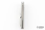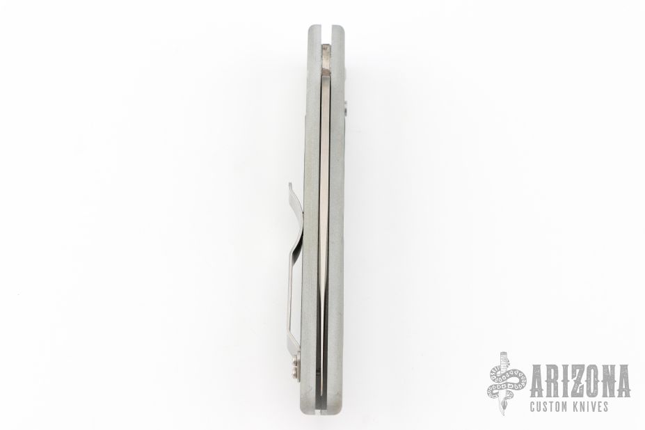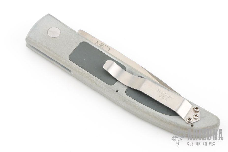 The 3000-CLR automatic from Benchmade is a discontinued model designed by Mel Pardue. Side opening, coil spring. Satin finish blade. Silver aluminum handle with rubber inserts and tip up stainless steel clip. Comes with Benchmade papers. Has scuffs and scratches, as well as some patina. Great condition otherwise.