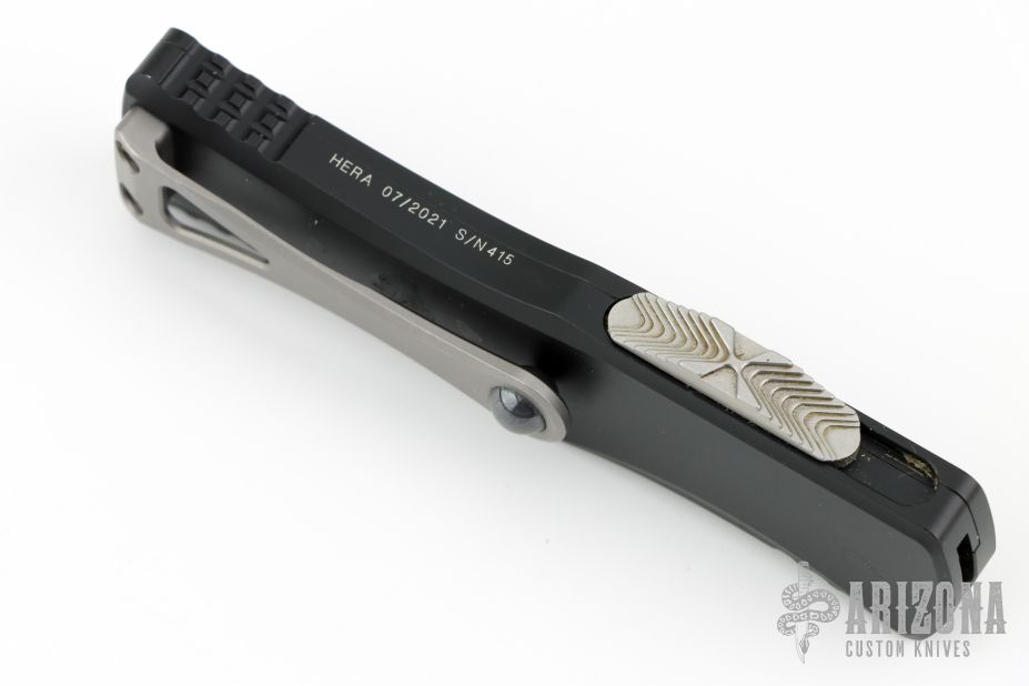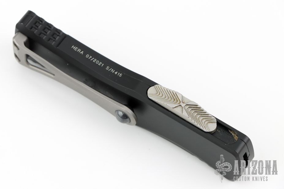 This Hera by Microtech Knives features a stonewashed blade. The handle has a black aluminum frame with a tip down titanium clip with ceramic ball inset. Dated 07/2021. S/N 415. Excellent condition.