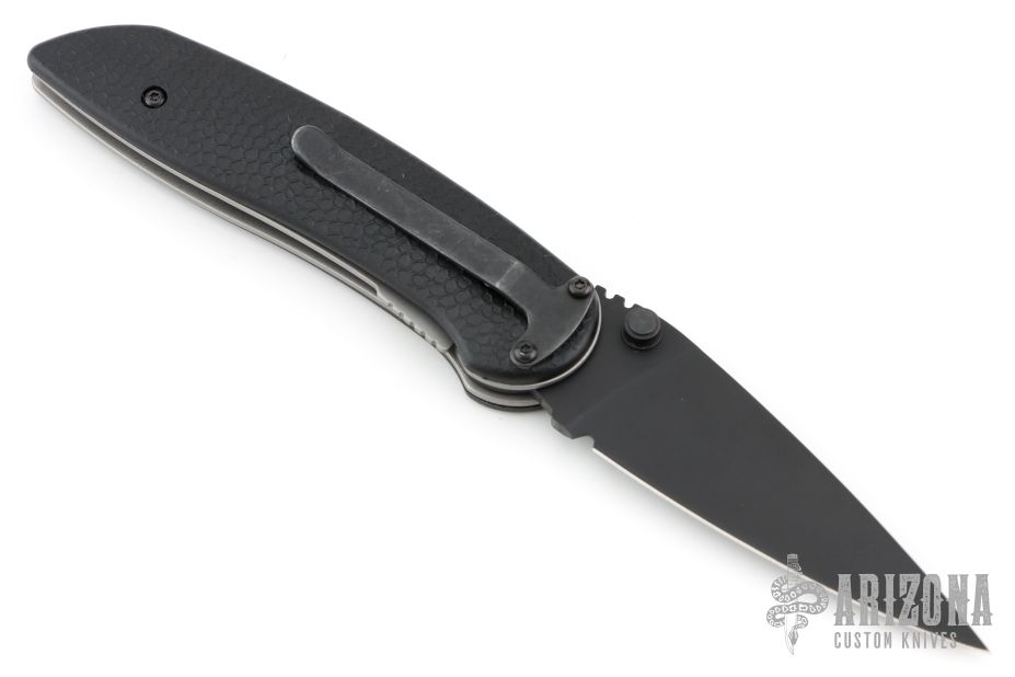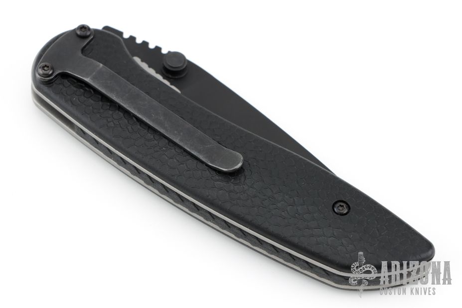 The H&K Scorch Code 3 features a unique dual-action design. The knife has a black drop point blade with notched thumbrest and dual thumbstuds. The handle is textured black FRN with black stainless steel liners and tip down clip. Comes in original box with pouch and papers. Has some scratches on the clip, excellent condition otherwise.