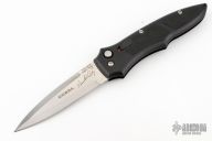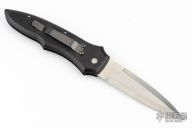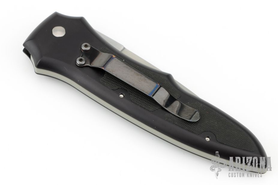 This Cobra side-opening automatic is from the custom series and features a hand ground hand rub satin finished blade by Harold Corby. Coil spring. Sliding safety. Black aluminum handle with rubber inserts, tip down black stainless steel clip. #911 on the blade. Excellent condition.