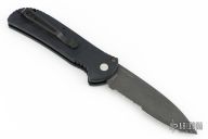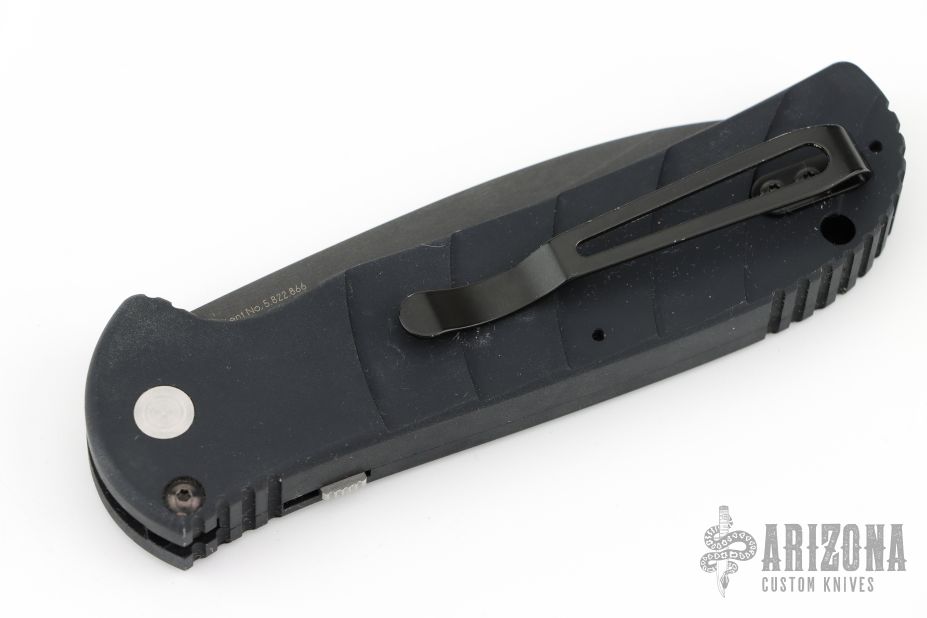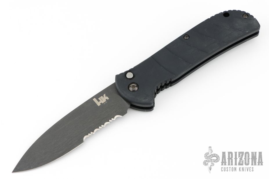 This auto by Heckler and Koch features a black drop point blade with partial serrations. The handle has a black aluminum frame with tip up black stainless steel clip. Has safety. Has a couple light scuffs, otherwise excellent condition. Comes with original box and papers.