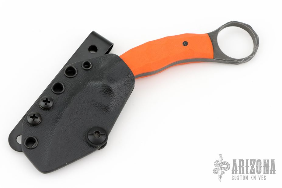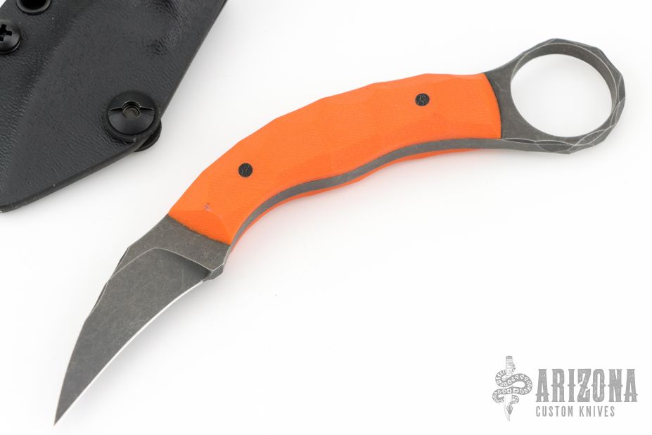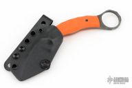 This Karambit by Auxiliary Manufacturing features an acid tumbled blade with textured spine, .196" blade stock and .643" blade depth. The handle has orange G10 scales with black linen micarta pins. Comes with a kydex neck sheath. New from maker!