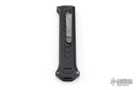 The blade is black and is double edged. The handle is milled aluminum with a black stainless steel pocket clip, tip down carry. The push button fires the blade and when open, allows you to retract the blade. Sliding safety. Has some minor wear on the blade finish, otherwise excellent condition.