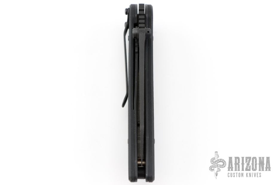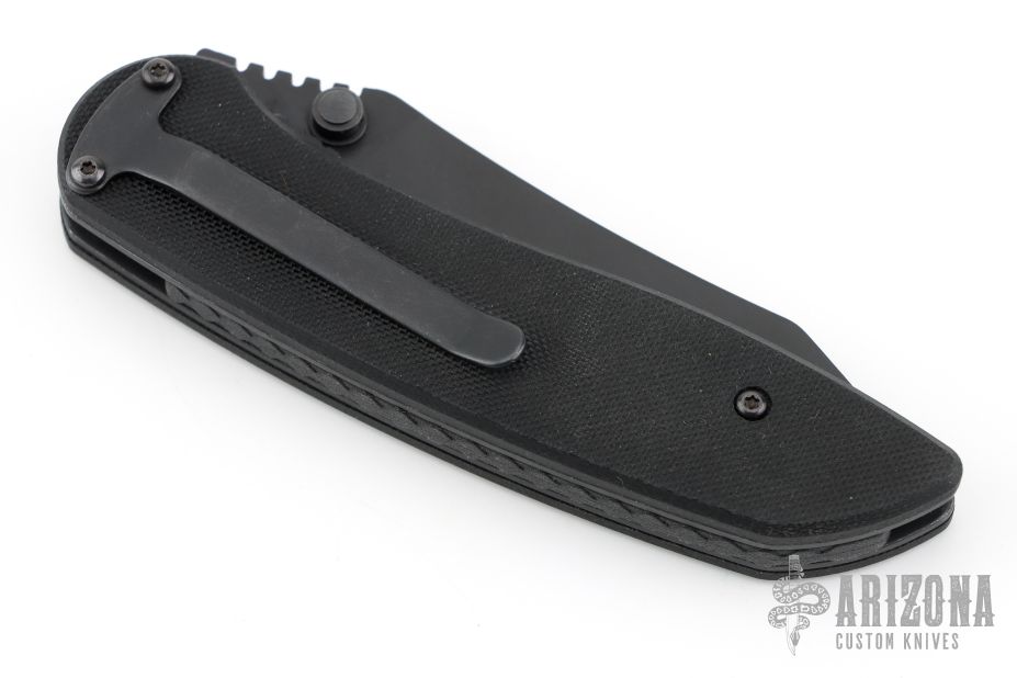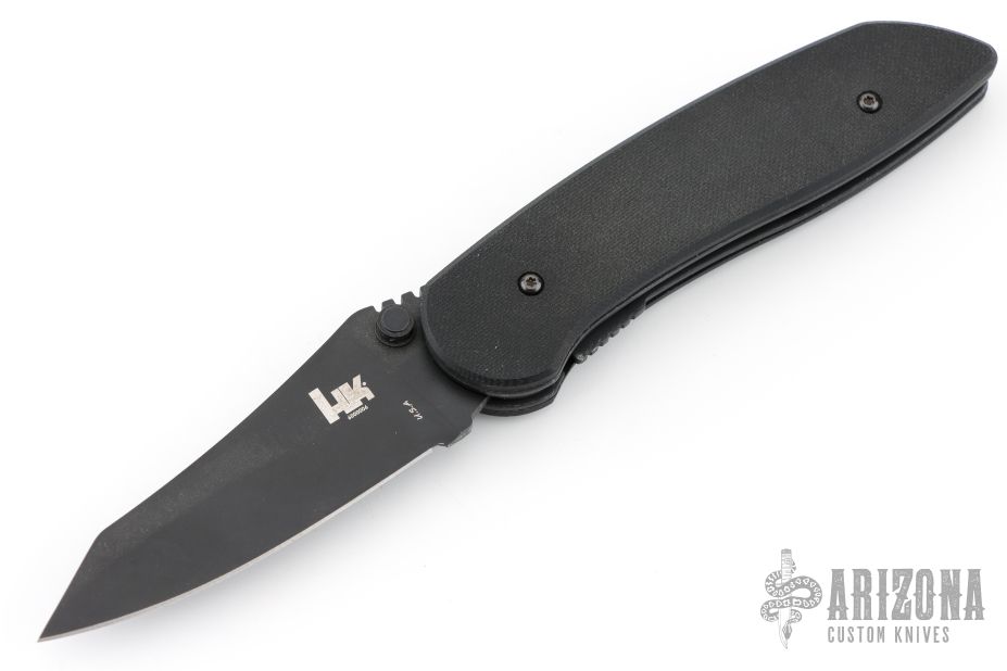 The H&K Scorch Code 3 features a unique dual-action design. The black blade is D2 tool steel with a reverse tanto design with notched thumbrest and dual thumbstuds. The handle is textured black G-10 with black stainless steel liners and tip down clip. Has a couple light scuffs, excellent condition otherwise.