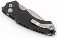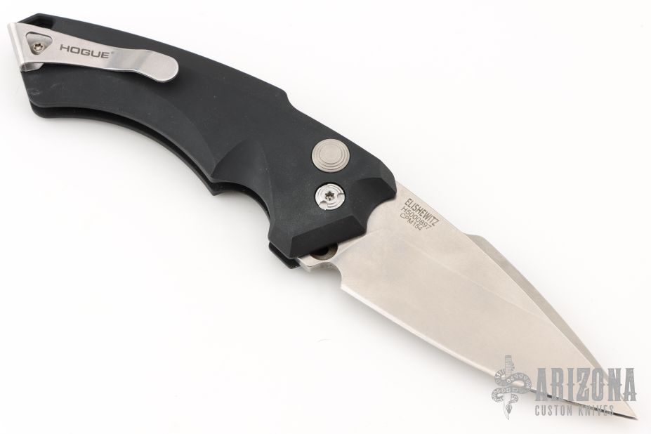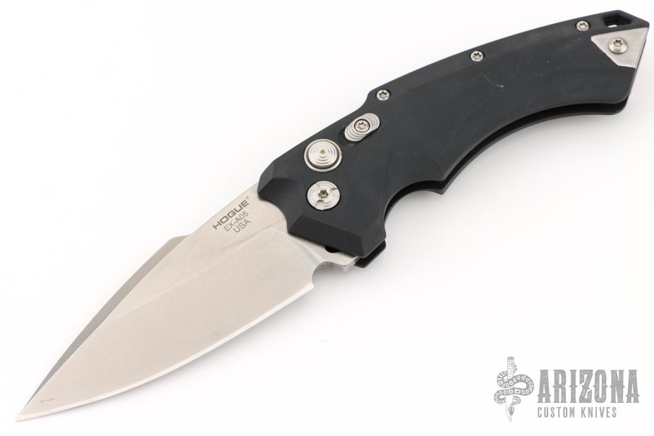 This EX-A05 by Hogue is an Allen Elishewitz design automatic. It features a stonewash spear point blade. The handle has a black aluminum frame with safety, and tip up reversible stainless steel clip. Has some scuffs, otherwise excellent condition. Comes with a zippered case.
