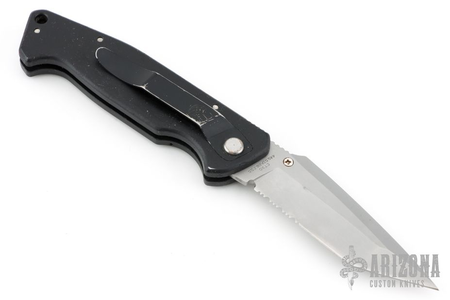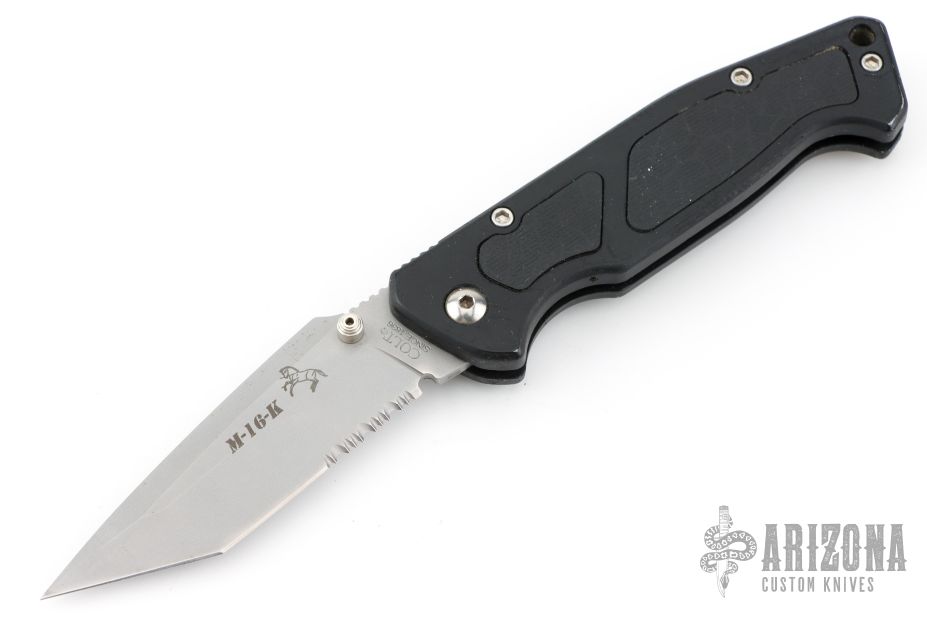 This M-16-K Police/ Military D/A has a bead blasted 440C stainless steel partially serrated tanto blade with dual thumb studs and notched thumb rest. Handle is coated black aluminum with non-slip inserts, tip down stainless steel clip and lanyard hole. Has some scuffs and scratches, some wear on the clip, otherwise good user condition.