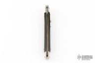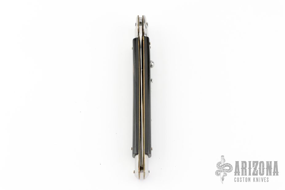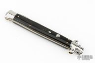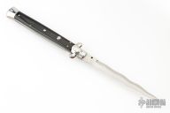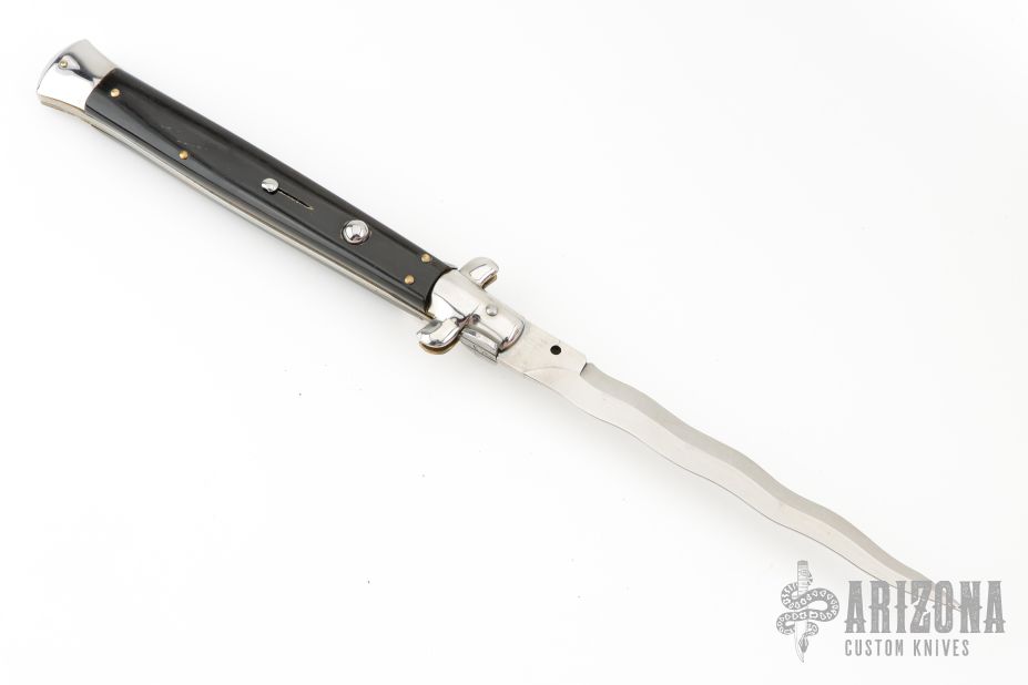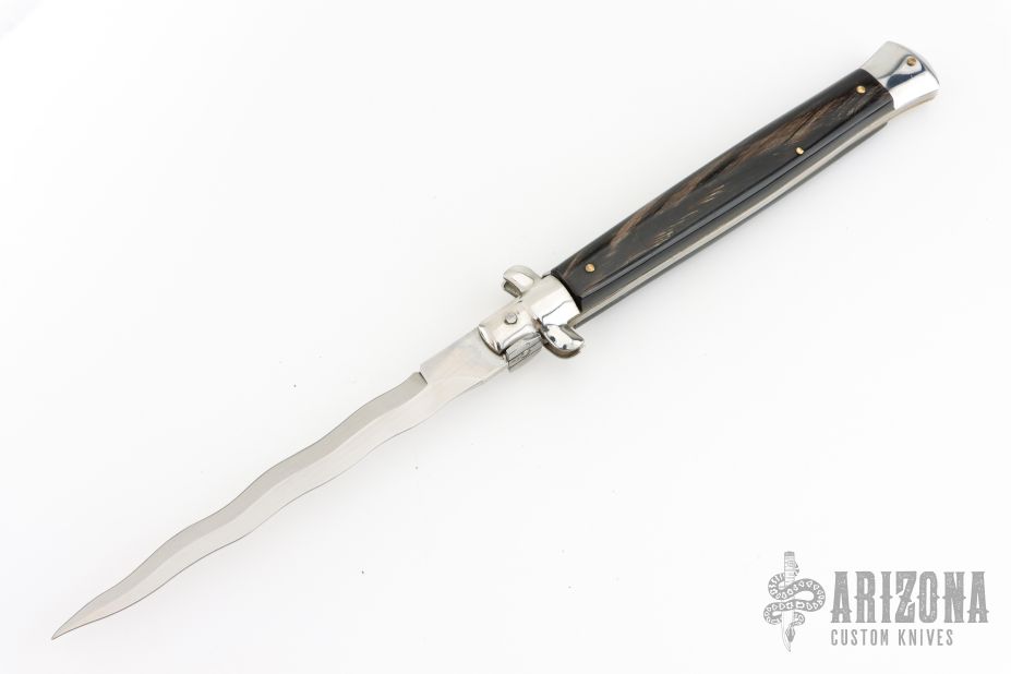 This Swivel Bolster Auto has a stainless steel Kris blade. The handle is composed of a steel front and rear bolsters, brass liners all complemented by buffalo horn scales. Has some scratches, otherwise good condition.