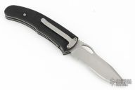 "The new Lobo automatic is a double-action automatic knife that can function as a one handed opening locking-liner knife or be instantly fired in the automatic mode. The Lobo has a 3.5 inch blade to handle any cutting chore and a convenient stainless steel pocket clip. The automatic firing mechanism is hidden under the handle and is activated by sliding the left side handle scale towards the top of the knife. Because there are no apparent buttons on the outside of the handle the fact that the Lobo is an automatic is known only to its owner. This makes the Lobo convenient to carry and use anywhere." This Lobo features a bead blasted blade and black G-10 handle. Has some light scuffs and scratches, great condition.
