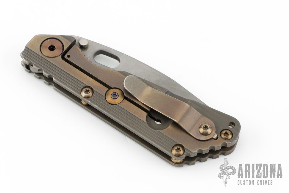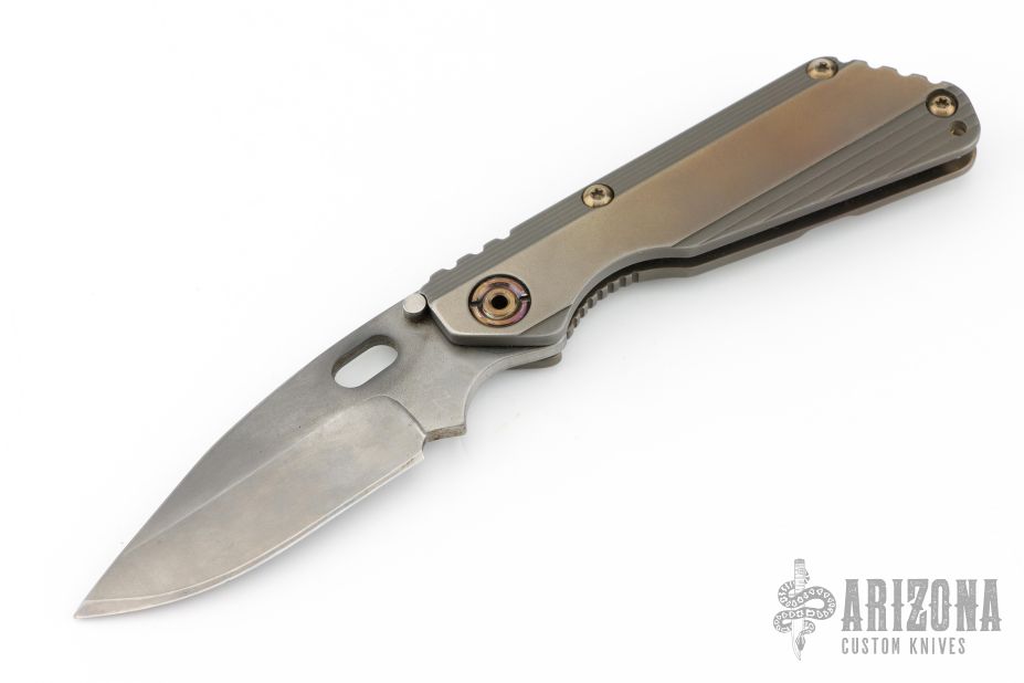 This DDC SNG features a gunmetal finished drop point Z-Wear blade with thumbhole. The handle has a stepped navel bronze and blasted and anodzied titanium frame with a matching tip up titanium clip. Nice detent, lockup and blade seating. Has scuffs, scratches, some light patina, and a couple rust spots. Appears resharpened. Great condition otherwise.