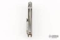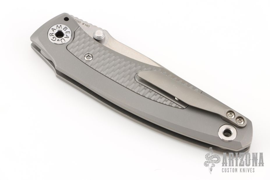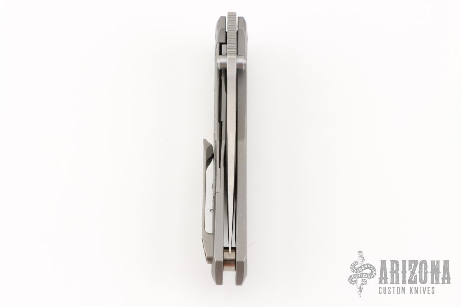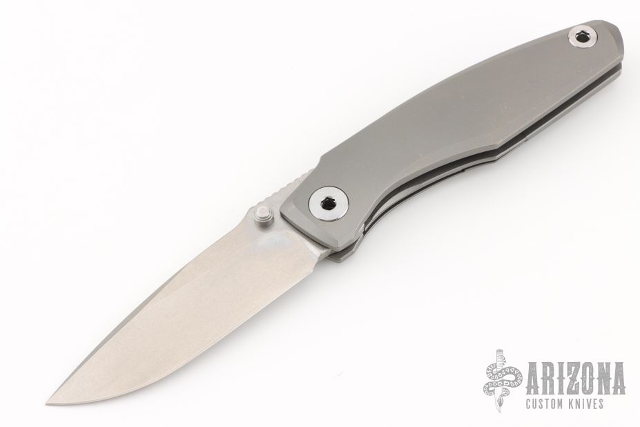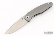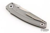 This Knife features a stonewashed blade with dual thumbstuds and a notched thumbrest. The handle features a tumbled titanium frame with a matching tip up pocket clip. Includes a padded zippered case and COA. S/N 140. Excellent Condition.