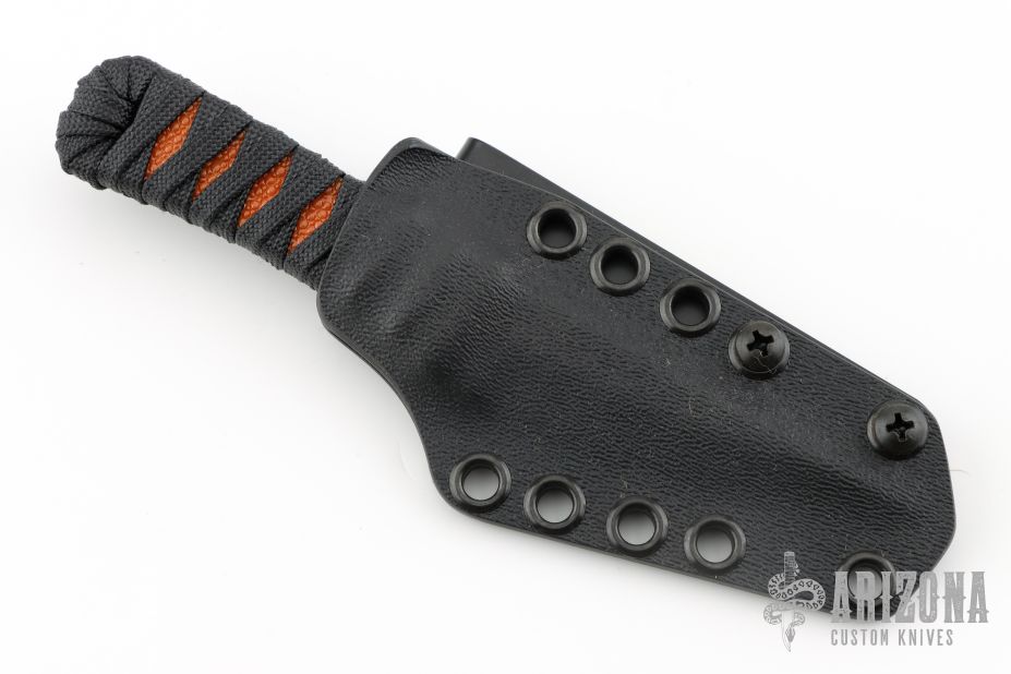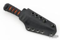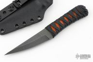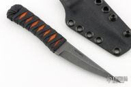 This KTK by Auxiliary Manufacturing features an acid finished blade with a hidden tang construction, .161" blade stock and .787" blade depth. The handle has epoxied black cord wrap over orange cord. Comes with a kydex neck sheath and the original box. New from maker!