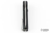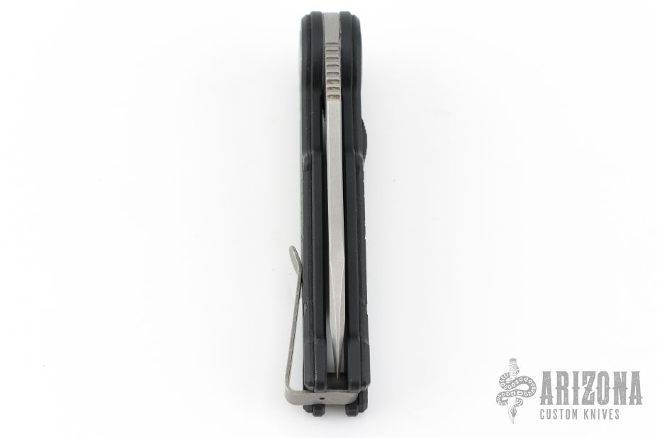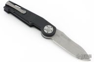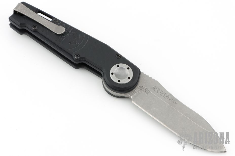 This MUDD Auto folder from Grant and Gavin Hawk features a bead blast finished spear point blade with notched thumb ramp. The handle has textured and engraved scales, black finished titanium frame, tip up reversible tumble finished titanium clip. Nice lockup and blade seating. Comes in maker's soft pouch. Has some light scuffs and scratches, great condition otherwise.