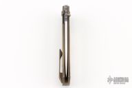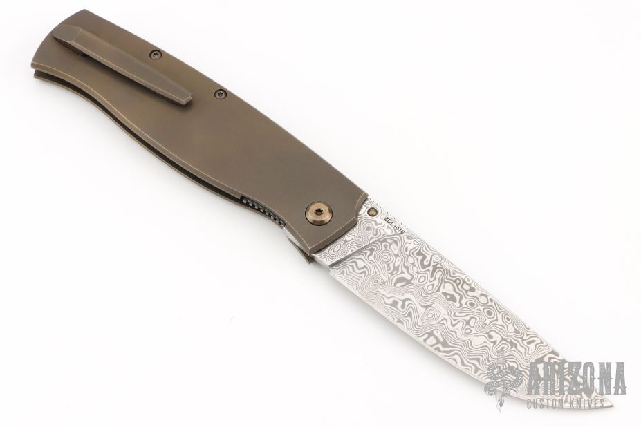 This Strizh by Alexander Cheberkov features a ZDI 1015 Damascus drop point blade with single thumbstud. The handle has a stonewashed titanium frame with blasted hardware and inlaid liner, matching backspacer and tip up clip with hidden screws. Giraffe bone overlay. Comes with original box and papers. Has a couple light scuffs, otherwise Excellent condition.