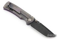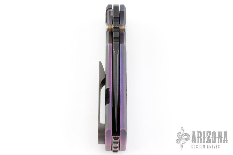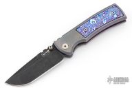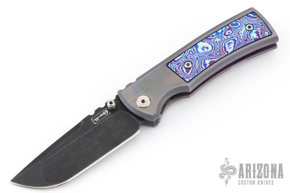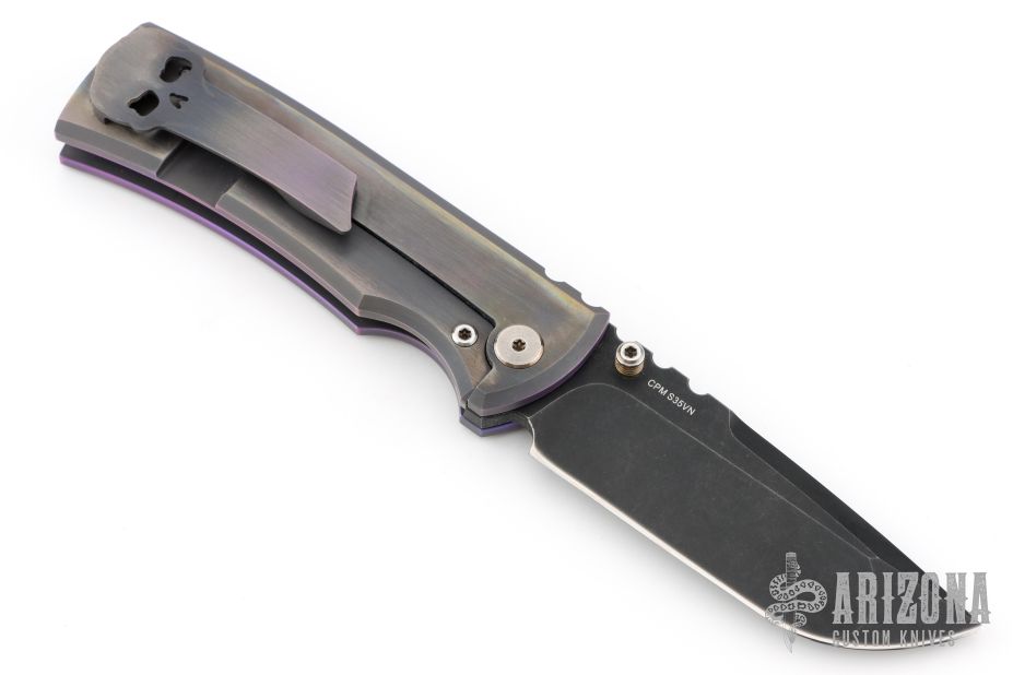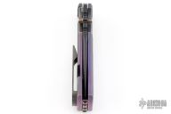 This Chaves Ultramar Redencion Street Tanto features a black coated, CPM S35VN tumbled tanto blade with the Chaves logo. The handle is made up of darkened/anodized/satin finished titanium scales with Timascus inlay on the presentation side, skull pocket clip with hidden screws (positioned for tip up carry), and Nichols Mokuti backspacer. Nice detent, lockup and blade seating.  Comes with original box, and some replacement inlays: green micarta, copper shred carbon fiber, purple wood, and purple bone. Has a couple light scuffs, otherwise excellent condition.