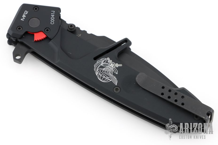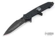 This Col Moschin Fighter by Extrema Ratio has a matte black N690 Cobalt stainless steel drop point blade with a notched thumb rest and dual thumbstuds. The handle has black aluminum handle with stainless steel liner and clip, tip up reversible. Comes with original box, and papers. Has a couple light scuffs and scratches, great condition otherwise.