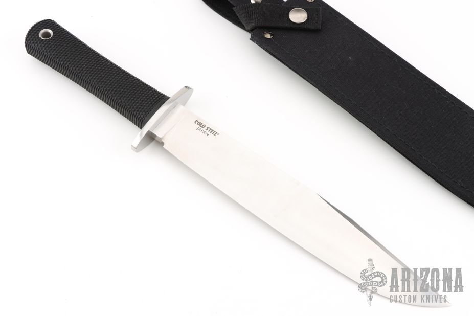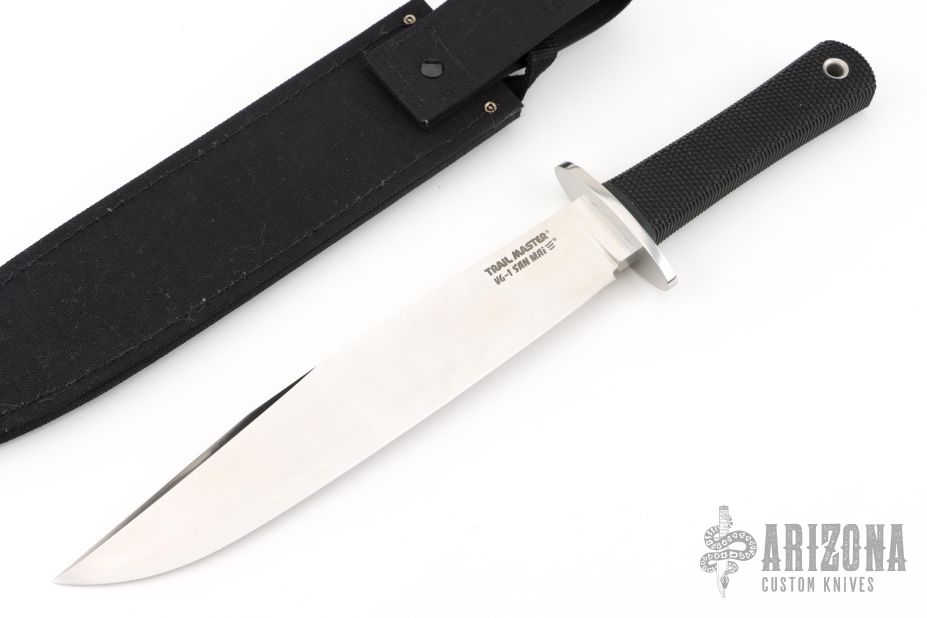 This Trail Master bowie from Cold Steel features a satin finished clip point blade with a false top edge, 5/16" blade stock and 1 1/2" blade depth, hidden tang construction. The handle has a stainless steel guard and a rubber handle. Comes with original box and nylon sheath. Excellent condition.