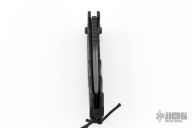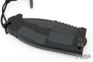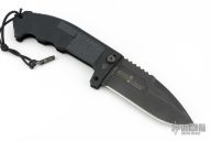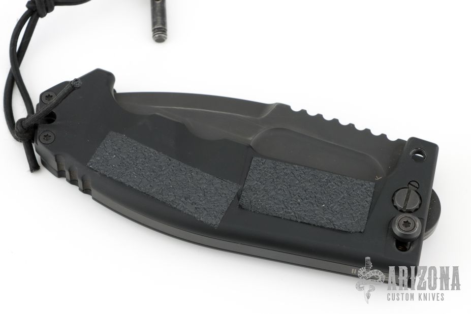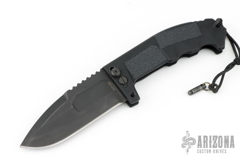 This RAO II Axis Lock Folder has a matte black finished N690 stainless steel spear point/ tanto blade (stamped CK0246Jon A-side) with notched thumb rest and multiple grind planes. This knife features a removable threaded pin that prevents deploying the blade when stored. Handle is black aluminum with lanyard and glass breaker. Comes with original box and papers. Has scuffs and scratches, and grip tape added to the frame. Good condition otherwise.