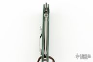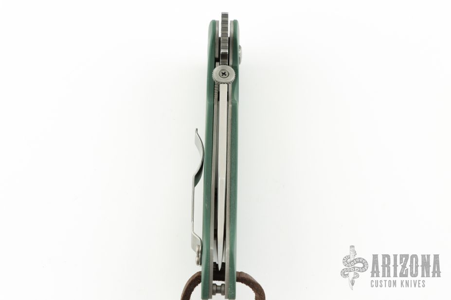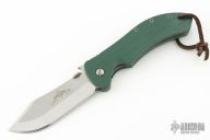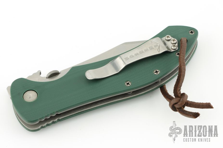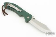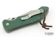 This Market Skinner by Emerson Knives features a two-tone blade with notched thumbrest and thumbdisc. The handle has custom green G-10 scales, titanium liners, tip up stainless steel clip. Comes with original box, black G-10 scales and papers. Nice detent, lockup and blade seating. Has been resharpened, otherwise excellent condition. #0130