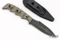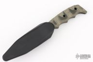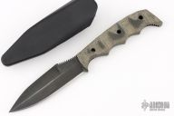 This Dynamis Alliance fixed blade was crafted by Daniel Winkler. IT features a spear point blade with false top edge and notched thumbrest. The handle is comprised of sculpted black canvas micarta scales over full tang construction. Jimping on pommel provides purchase when holding in the reverse grip. Includes a molded plastic sheath with metal clip. Includes original box and papers. Has scuffs and scratches throughout, good condition otherwise.