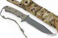 "Continuing the proud tradition of Chris Reeve Knives honoring elite military, the Reeve/Harsey collaboration - the Pacific - is the civilian version of a knife created to celebrate the 50th Anniversary of 1st Special Forces Group. Based in Ft. Lewis, WA, 1st Group's theatre of operations is Asia and the Pacific, so the name Pacific has been chosen to honor the home and work place of these fine soldiers." Comes with camo nylon spec-ops sheath. This version has serrations, no card so the blade steel is marked unknown. Has a couple light scuffs and scratches, excellent condition otherwise.