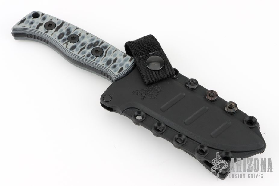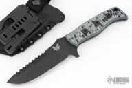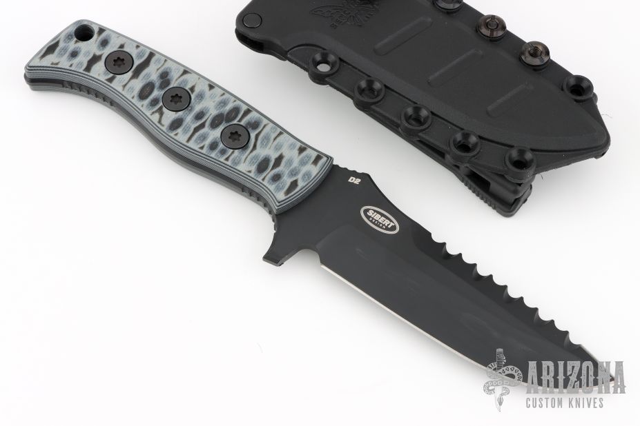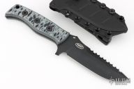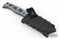 This Fixed Adamas fixed blade combat knife was designed by Shane Sibert. The black finished D2 steel drop point blade has a plain cutting edge and jimping on the spine. The handle is skeletonized with optimally positioned grooves. The Fixed Adamas knife also comes with a black molded sheath with secondary locking strap and tension screw for secure storage and custom tuned deployment.