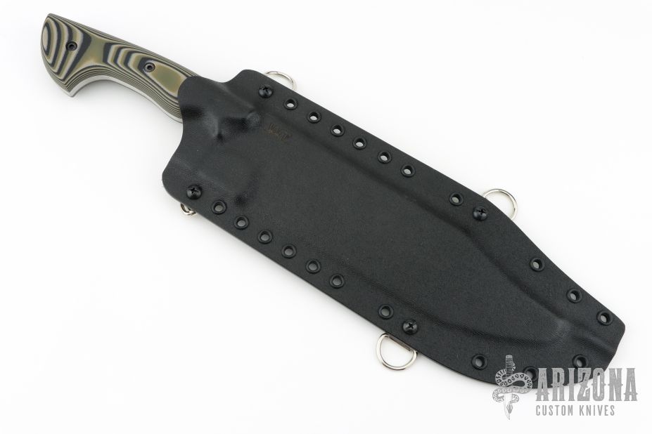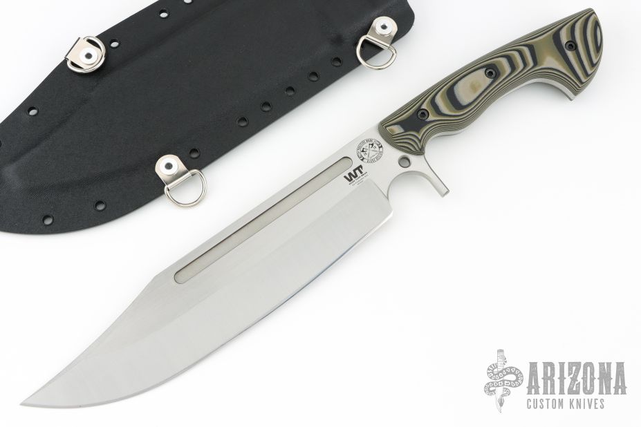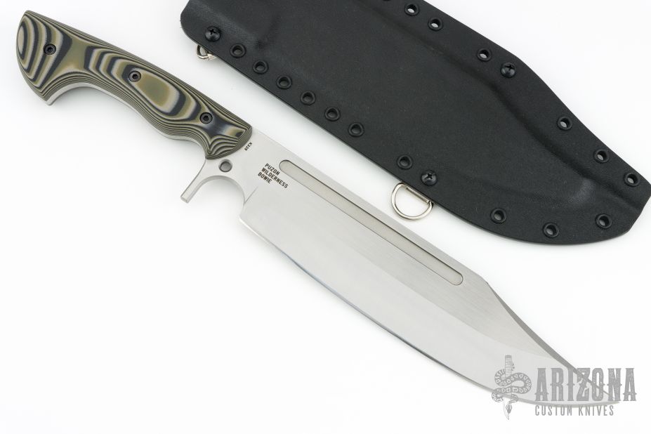 This Puzon Wilderness Bowie by Work Tuff Gear features a satin finished K329 Steel blade with a saber grind that has a convex cutting edge, has fullers, .222" blade stock and 2.211" blade depth, full tang construction with Forest Camo G-10 scales. Comes with original box, kydex sheath and extras. Excellent condition.