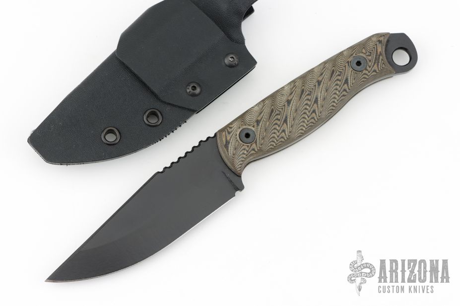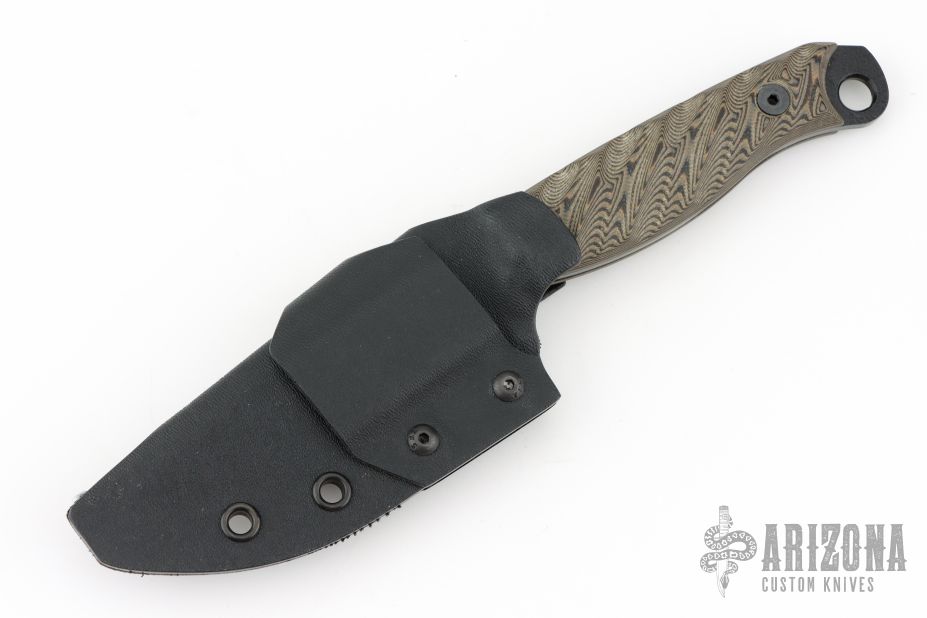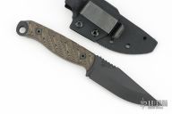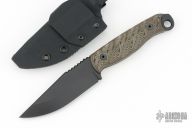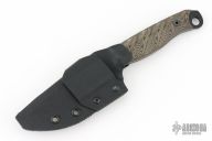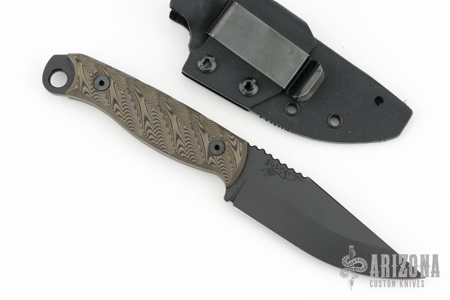 This Crow Jr by Half Face Blades features a cerakote blade with a notched thumbrest, .153" blade stock, 1.330" blade depth, full tang construction.  The handle has black and coyote brown G-10 scales.  Comes with a kydex sheath with clip. Has a couple light scuffs. Excellent Condition.