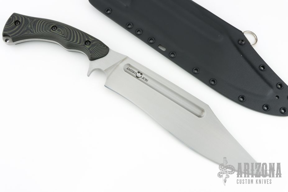 This Amish John by Work Tuff Gear features a hand rub satin finished SK85 Steel blade with fullers, .266" blade stock and 2.510" blade depth, full tang construction with black/green G-10 scales. Comes with original box, kydex sheath, zippered case and extras. Excellent condition.