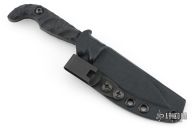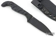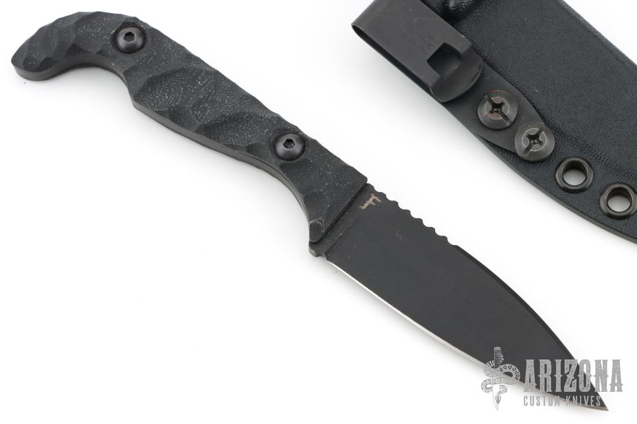 This knife features a black cerakoted blade with a notched thumbrest, .153" blade stock, .901" blade depth, full tang construction.  The handle has black G-10 scales.  Comes with a kydex sheath with clip. Has some light scuffs and scratches, good condition otherwise.
