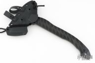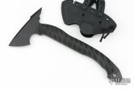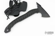 This Bleeding Heart Tomahawk by Half Face Blades features a black cerakoted 2.05" blade with chisel tip at the rear, .2408" blade stock, full tang construction. The handle has black G-10 scales. Comes with a kydex sheath. Has a couple light scuffs, otherwise Excellent condition.