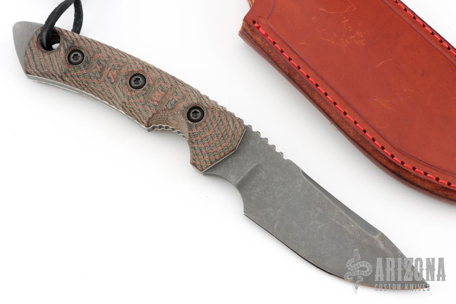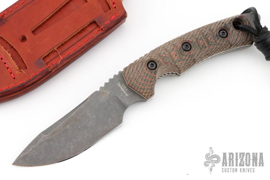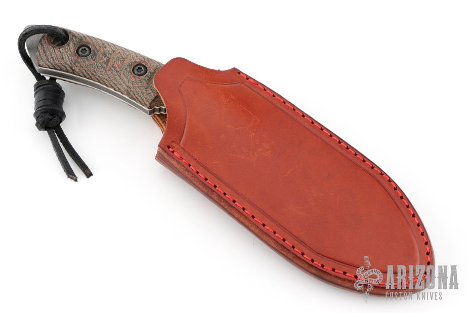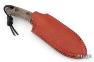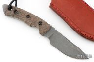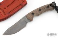 This Fobos Tier1 Mini features a stone washed and acid etch finished drop point blade with false top edge, .188" bladestock, 1.24" blade depth, notched thumb rest, and full tang construction. The handle features micarta covers, white liners, notched finger choil and lanyard hole in pommel. Comes with original box, papers, and leather sheath. Has a couple light scuffs, otherwise excellent condition.