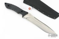 This Murakumo by Kiku Matsuda features a SPG-2 San Mai blade with false top edge with notched thumbrest, .239" blade thickness and 1.708" blade depth, full tang construction. The handle has black G-10 scales. Comes with kydex sheath and original tag. New condition.