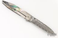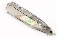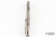 This Prisma framelock folder by GTC Knives features a Damasteel blade with notched thumbrest, pearl thumbstud. The handle has a satin finished titanium frame with pearl inlays, checkered Damasteel backspacer and a Damasteel tip up clip, lanyard hole at the butt. Nice detent, lockup and blade seating. Inside the backspacer reads: "Damasteel/Titanium Prisma - 26/03/2009". Comes with original box, and a soft pouch. Has a couple light scuffs and scratches, Excellent condition otherwise. A nice older piece from Gus.