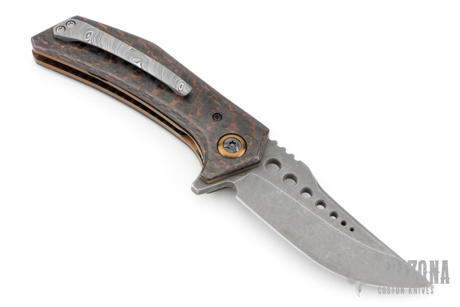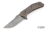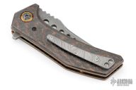 This Metalhead Flipper by Randy Doucette has an acid tumble finished blade with a notched thumbrest and flipper. Handle has copper carbon fiber scales, anodized titanium pivot collars, anodized titanium liners and barrel spacers, tip up Damascus clip. Nice detent, lockup and blade seating. Excellent condition. Runs on bearings. Comes with a zippered case.