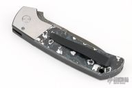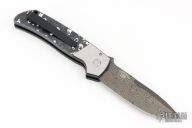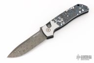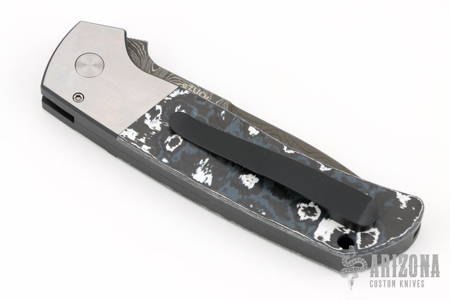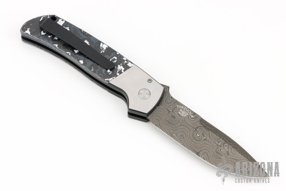 This ATCF Auto by Pro-Tech features a Chad Nichols Stainless Damascus blade with notched thumbrest. The handle has a 416 SS frame with White Storm scales, pearl inlaid push button, tip up milled titanium clip with hidden screws and DLC finish. Comes with original box, deluxe wood box, and drawstring pouch. Excellent condition.