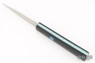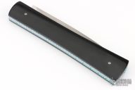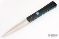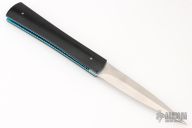 This D&D Fantail Auto by Rainy Vallotton features a satin finished dagger blade with a false top edge. The handle has vintage Westinghouse black paper micarta scales, anodized push button, anodized titanium liners with file worked edges, jeweled interiors, and a stainless steel backspacer. Strong and fast leaf-spring opening, nice lockup and blade seating. Comes with Maker's zippered case and COA. Has some light scuffs, otherwise Excellent condition.