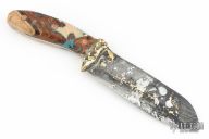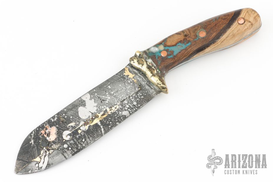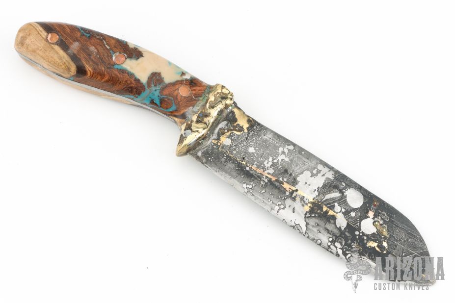 This knife by Miles Martin has a Meteorite (Metllanuska Meteorite) blade with a high carbon Damascus cutting edge so the knife is functional, .131" blade stock and 1.410" blade depth, full tang construction. Copper and brass are forged into the blade to give it a one of a kind look. The guard is a lost wax cast otter made just for this knife from a bronze Yukon river barge propeller. The handle has Arizona ironwood scales that are stabilized with resin. New from maker. Comes with a note from the maker!