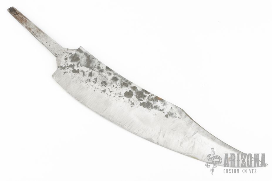 This knife blank was sent in by Miles Martin. It features a hand forged blade with sharpened top edge, .244" blade stock and 2.245" blade depth, set up for hidden tang construction.  Hardened to R59. Roughly shapped and taken to about 200 grit, with a sharpened but not finished edge. Made by "CT" in the 1960's from a Chevy car leaf spring by a blacksmith of the time just known as a motorcycle guy making blades in Quartzite Arizona, a desert empty wilderness land at the time. Acquired in trade from Arizona Street Vendor. A somewhat rare period made in an old style coal forge and hammer unique to this time period. Note the very deep stamp by the maker.