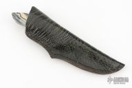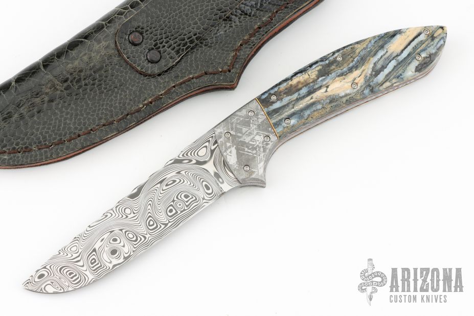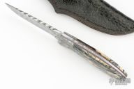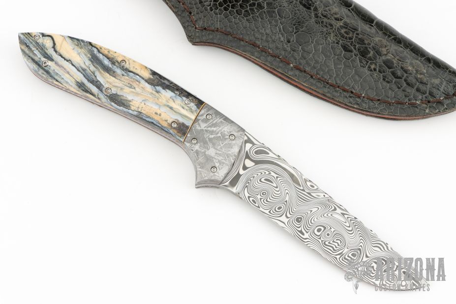 This knife by George Muller features a mirror polished Damasteel drop point blade with fileworked spine, .153" blade stock and 1.076" blade depth, full tapered tang construction. The handle has dovetailed meteorite bolsters, file worked and anodized titanium liners, with red/yellow liners, and mammoth molar covers. Comes with original leather belt sheath. Has a few light scratches, otherwise excellent condition.