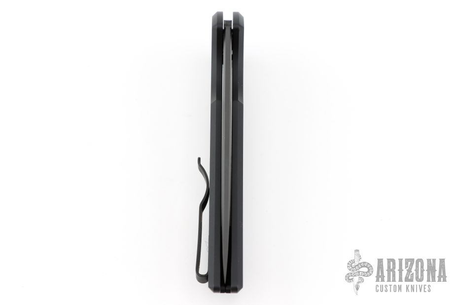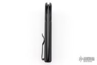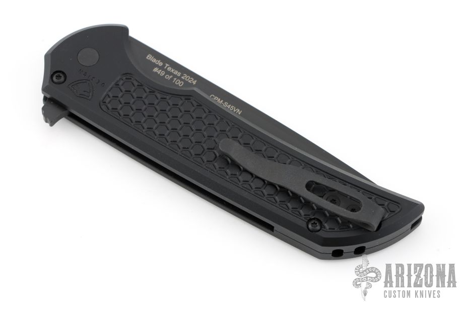 This Mordax by Pro-Tech is a Ferrum Forge design and features a black drop point blade. The handle has milled black aluminum frame with black tip up stainless steel clip. Abalone inlaid push button. Comes with original box, pouch, and papers. Excellent condition.